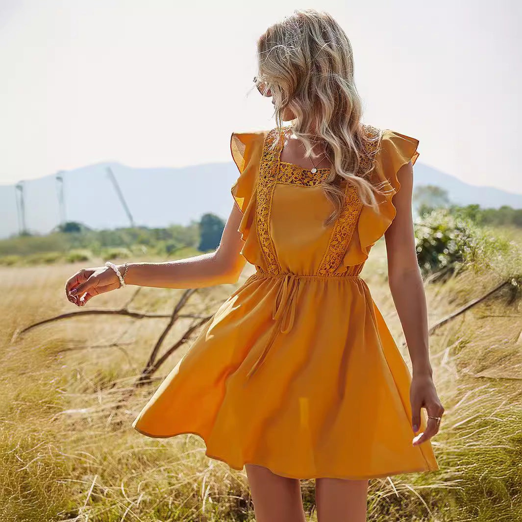Women's Solid Color Stitching Lace High Waist Big Swing Dress